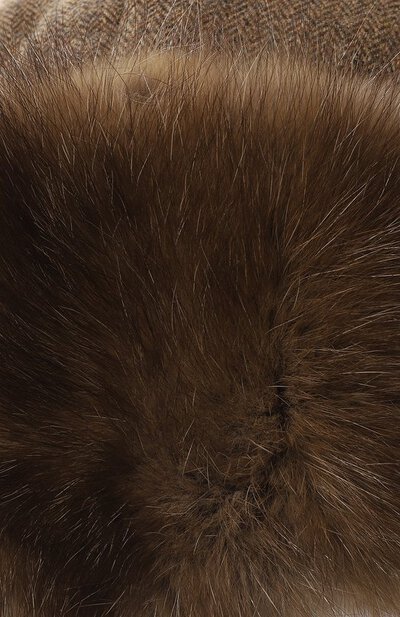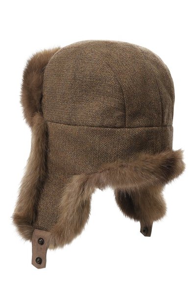 Коричневую шапку-ушанку сшили из плотного кашемира с шевронным переплетением нитей и шелковистого меха соболя. Головной убор из таких материалов отлично сохраняет тепло и не продувается ветром, поэтому в нем будет комфортно даже в сильные морозы. Широкие наушники фиксируются под подбородком короткими ремешками с кнопками.