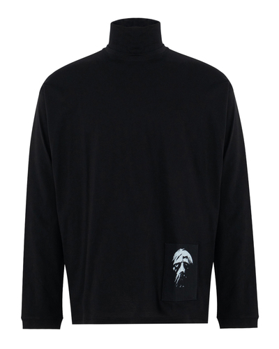 Модель с воротником стойкой выполнили из плотного хлопкового трикотажа. Изделие украсили текстильным патчем с белым графичным рисунком спереди.