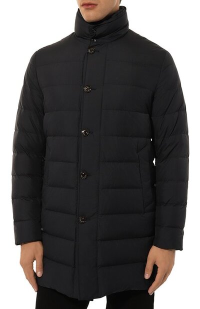 Стеганую куртку на утином пуху с добавлением пера дополнили съемной манишкой с воротником-стойкой. Модель с небольшими боковыми разрезами, внутренним карманом и двумя внешними сшили из прочного полиэстера.