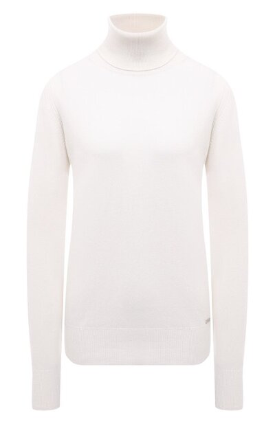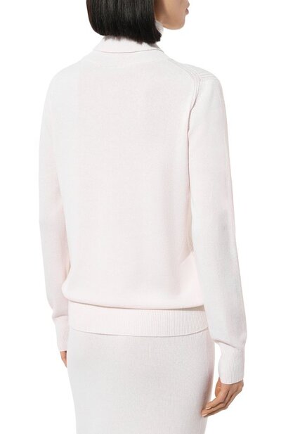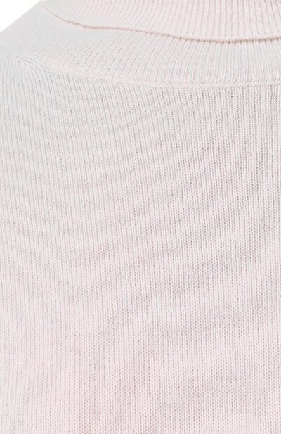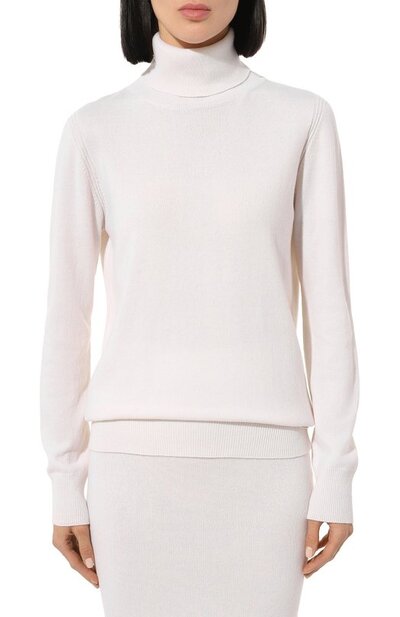 Водолазку с рельефной отделкой вдоль швов наши стилисты предлагают сочетать с черной юбкой-миди и сапогами. Модель с миниатюрной фирменной пластиной над поясом в рубчик связали из кашемира.