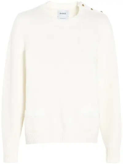 white lambs wool knitted construction crew neck decorative button detailing long sleeves ribbed cuffs ribbon detail two front patch pockets ribbed hem