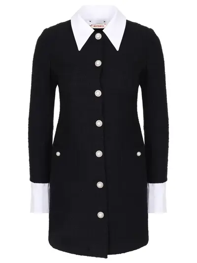 -Черное мини-платье из твида купажированного состава от BOTROIS. -Модель приталенного кроя с длинными рукавами, контрастными манжетами и отложным воротником, крупными накладными карманами по бокам, застежкой на оригинальные жемчужные пуговицы.