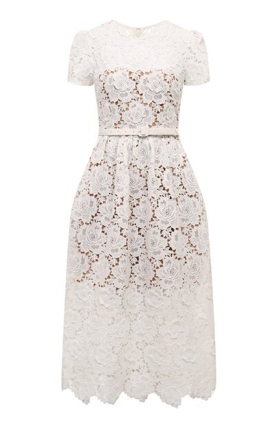 Миди-платье с расклешенным подолом – идеальная основа романтичного нарядного образа. Для пошива модели с молнией на спинке использовали цветочное кружево. Бежевый подклад создает иллюзию, что изделие надето на голое тело.