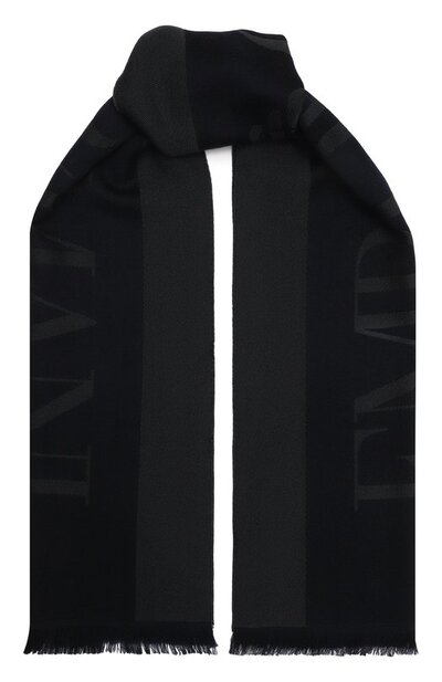 Для создания шарфа использовали мягкую фактурную шерсть. Длинный аксессуар с крупным жаккардовым логотипом марки отделан по краям короткой густой бахромой.