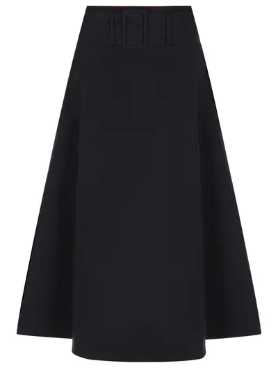 -Черная юбка-миди из тонкой шерсти от LORENA ANTONIAZZI. -Расклешенная модель А-силуэта с высокой посадкой на талии, которую подчеркивает широкий пояс с пряжкой, продетый сквозь шлевки, прорезными карманами, застежкой на молнию сзади.