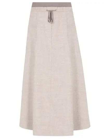 -Серо-бежевая юбка-миди из тонкой шерсти от LORENA ANTONIAZZI. -Расклешенная модель с высокой посадкой на талии, которую подчеркивает пояс с трикотажной отделкой и кулиской, и карманами по бокам.