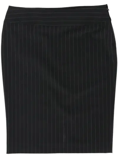 circa 2000s black wool blend pinstripe pattern concealed side zip fastening buckled belt detail straight hem thigh-length Condition: GOOD. This previously owned and used item is in good condition with minimal signs of use. This may include fading of material or plating and scratches.