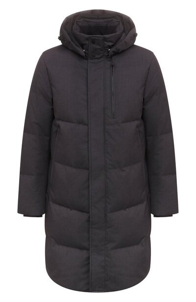 Парку Aron выполнили из водоотталкивающего трехслойного твила с мембраной и утеплили утиным пухом. Модель со съемным регулируемым капюшоном, двойным внутренним и тремя внешними карманами украсили фирменной эмблемой. Изделие с боковыми разрезами на молниях дополнили лямкой, позволяющей носить снятую вещь на плече.