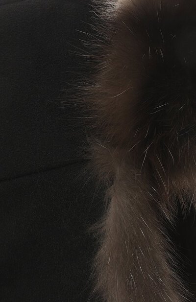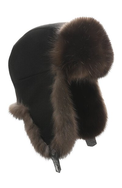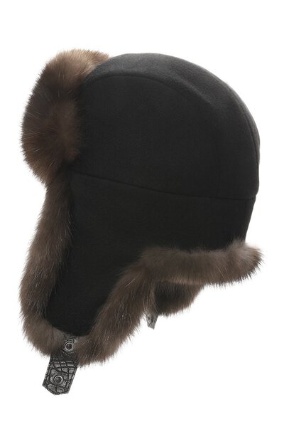 Шапку-ушанку изготовили из фактурного драпа и меха соболя с естественной сединой. Наушники можно соединить на макушке или под подбородком с помощью кожаных ремешков на кнопках.