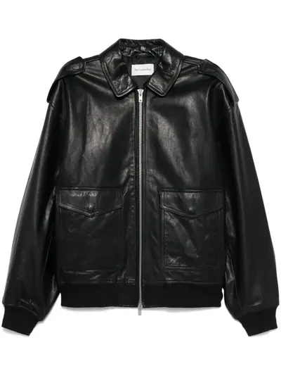 black calf leather front two-way zip fastening classic collar drop shoulder epaulettes long sleeves ribbed cuffs two front flap pockets ribbed hem full lining