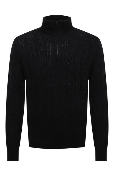 Кашемировый джемпер со сплошным арановым узором комфортно носить как поверх рубашки, так и на голое тело. Молнию на высокой горловине укрепили кожаным кантом в тон. Сзади – фирменная пластина.