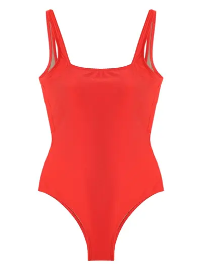 brick red stretch-design scuba jersey slip-on style thin shoulder straps square neck fitted waistline open back high cut Be mindful to try on swimwear over your own garments.