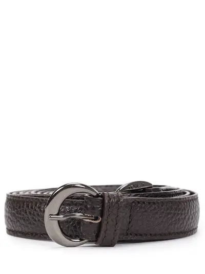 -Коричневый ремень из зернистой кожи от TONET. -Узкая модель с округлой пряжкой и кожаной шлевкой подойдет для классических и повседневных образов. -За айдентику бренда отвечает выгравированный логотип на металлической пластине.
