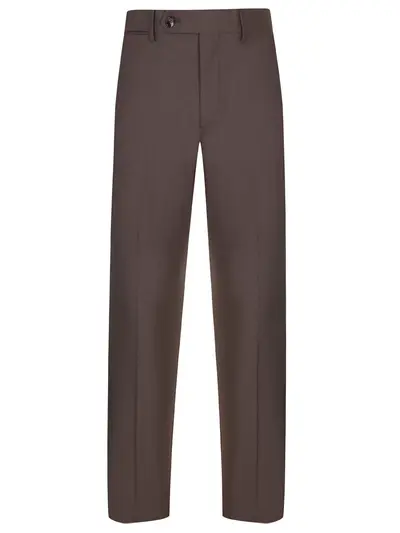 -Коричневые классические брюки из тонкой шерсти от BERWICH. -Модель стандартного кроя и посадки с поясом со шлевками, прорезными карманами, застежкой на молнию и пуговицу, графичными стрелками, которые визуально вытягивают силуэт.