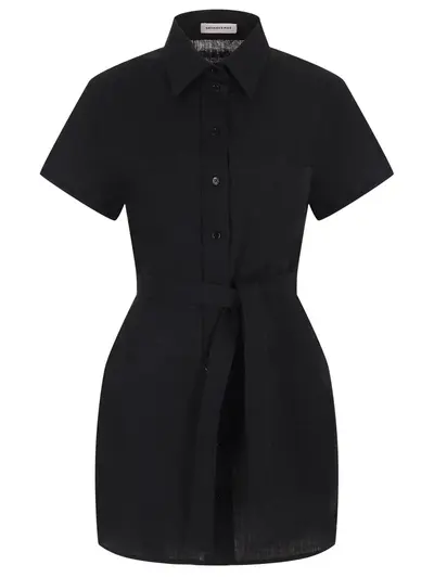 -Черное платье из дышащего льна от SASHAVERSE. -Модель прямого кроя с короткими рукавами, отложным воротником, накладным карманом и застежкой на пуговицы. -Акцентный пояс в тон подчеркивает талию и структурирует силуэт.