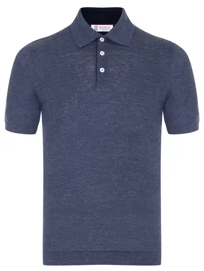 -Темно-синее трикотажное поло из меланжевого смесового льна с добавлением хлопка от BRUNELLO CUCINELLI.
