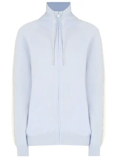 -Оригинальную ноту изделию придают контрастные лампасы рукавов, вывязанные косицами, и высокий воротник с функциональной кулиской, которая поможет сохранить тепло в прохладные вечера.