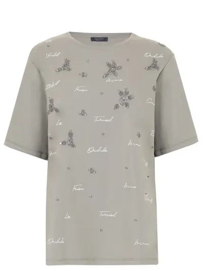 -Модель свободного кроя с широкими рукавами, круглым вырезом горловины, сдержанным принтом, декором металлофурнитурой и кристаллами.