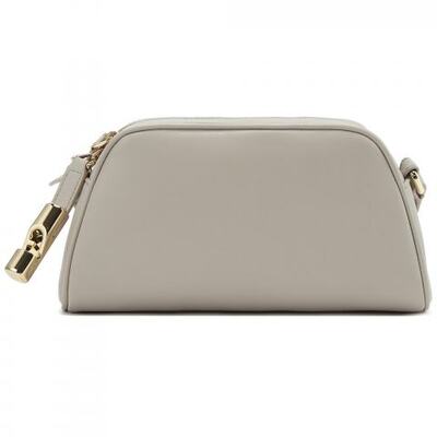 Сумка FURLA из натуральной кожи в светло-сером цвете. Небольшая сумочка выполнена из натуральной кожи и дополнена двусторонней молнией с необычной сияющей цилиндрической фурнитурой с логотипом Arch на одном из кожаных язычков. Ремень из кожи регулируется по длине. Внутри дополнительный карман на молнии.