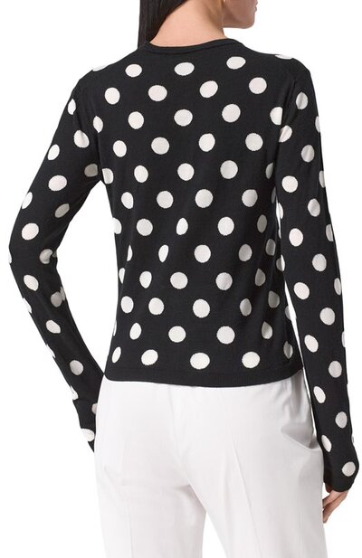 Кардиган в крупный горох включили в коллекцию Mambo, вдохновленную модой 1940-50-х. Приталенная модель из микса шерсти и шелка получилась особенно тонкой — плотностью 18 петель на дюйм.