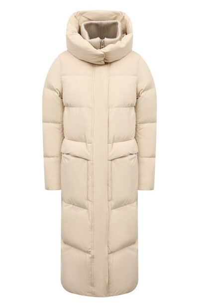 Стеганое пальто с кулиской снизу и двумя боковыми карманами выполнили из полиамида и наполнили утиными пухом и пером. Модель на встречной молнии, скрытой под кнопочной планкой, дополнили трикотажным воротником-стойкой и съемным капюшоном с магнитной застежкой.