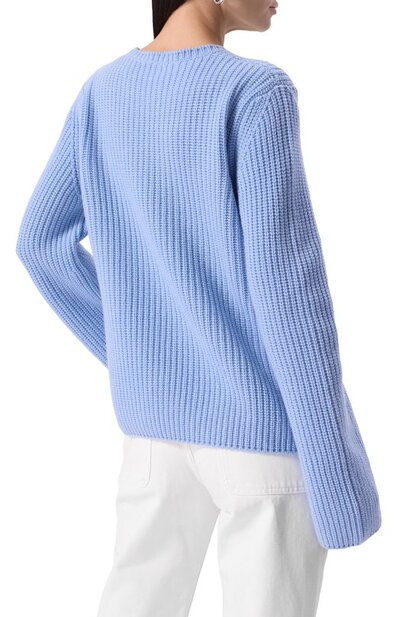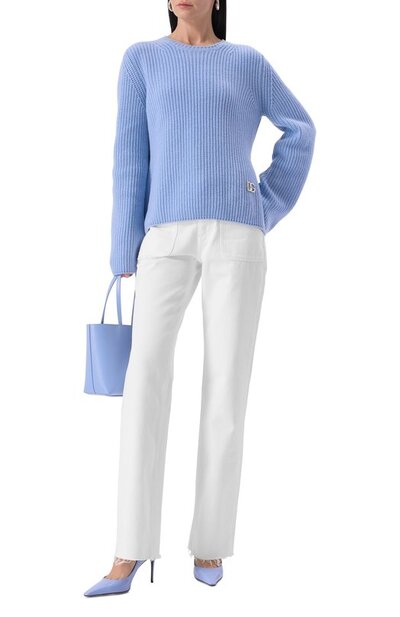 Кашемировый свитер с круглой горловиной в рубчик и удлиненными рукавами декорировали золотистой монограммой DG. Модель, связанная английской резинкой, сделает уютнее образ в оттенках голубого.