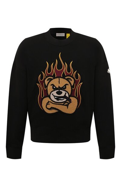 Хлопковый свитшот из коллаборации с Palm Angels украсили спереди крупной аппликацией Angry Bear, а сзади — контрастным логотипом. На левом рукаве — фирменный патч с символикой Moncler.