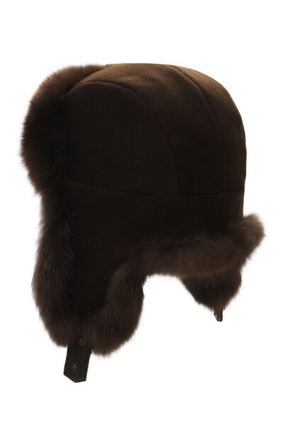 Для изготовления шапки-ушанки с кожаными ремешками на кнопках использовали непродуваемый текстиль и неокрашенный соболий мех. Аксессуар, выполненный по технологии Furland climate, дополнили гофрированной подкладкой, которая не электризует волосы и не сминает прическу.