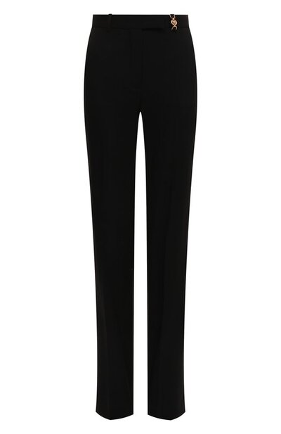 Брюки из эластичного шерстяного габардина дополнили боковыми и прорезными карманами сзади, застегивающимися брендированными пуговицами. Пояс модели декорировали металлической эмблемой Medusa.
