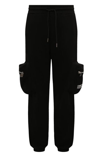 Джоггеры из хлопкового трикотажа дополнили боковыми карманами и крупными карго на молниях с пуллерами в виде эмблемы. О принадлежности модели марке говорит и контрастный логотип.