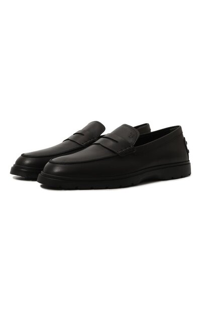 Пенни-лоферы из кожи украсили тисненой монограммой и накладкой с резиновыми шипами, как на знаковых мокасинах Gommino. Пару установили на выступающую подошву с нескользящим протектором.