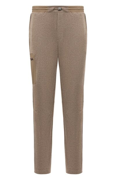 Меланжевые брюки из кашемирового трикотажа дополнили четырьмя прорезными карманами и одним карманом карго из гладкого текстиля. Из такого же материала выполнили и широкий эластичный пояс-кулиску с фактурной петлей сзади.