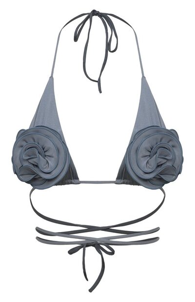 Мягкие треугольные чашечки бра из слегка блестящего нейлона стрейч декорированы аппликациями в виде роз. Узкий пояс-ленту сделали более длинным, чтобы его можно было перекрестить на талии.