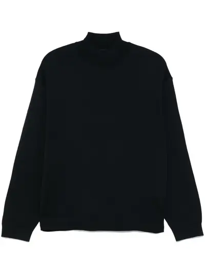 navy blue virgin wool knitted construction ribbed trim mock neck drop shoulder long sleeves embroidered logo to the side straight hem