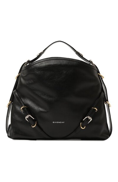 Сумку Voyou с регулируемыми ручкой и съемным плечевым ремнем изготовили из мятой телячьей кожи. Модель с внутренним карманом на молнии украсили серебристым логотипом и узкими ремешками с брендированными пряжками и полукольцами.