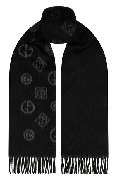 Шарф из ворсистой кашемировой пряжи декорирован жаккардовыми монограммами GA и отделан по краям бахромой. Длины изделия хватит, чтобы несколько раз обернуть его вокруг шеи.