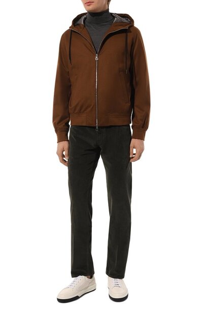 Прямые брюки с пятью карманами могут стать альтернативой джинсам в повседневном образе. Модель с классической посадкой сшили из слегка эластичного хлопкового вельвета с добавлением кашемира. Сзади на поясе – кожаный патч с тисненым логотипом марки.