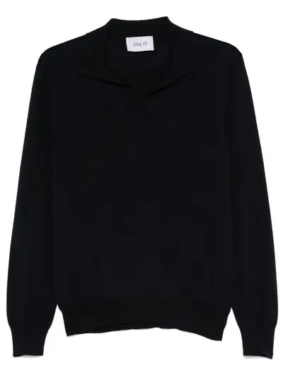navy blue virgin wool fine knit polo collar V-neck long sleeves ribbed cuffs and hem