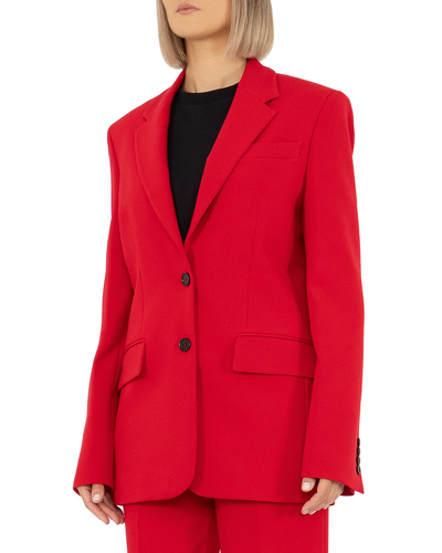 Жакет с однобортной застежкой на пуговицы выполнен из костюмной ткани. Модель полуприлегающего кроя дополнена подплечниками и подкладом. Отложной воротник с лацканами, манжеты с пуговицами, два функциональных кармана с клапанами.