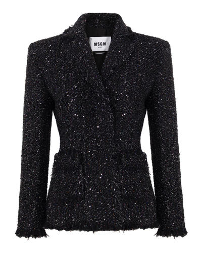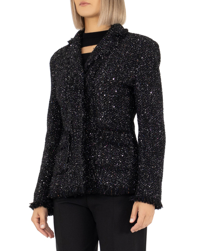 Пиджак с накладными карманами сшили из смесового хлопкового твида, в который вплели серебристый люрекс и пайетки. Края изделия, контуры лацканов, манжеты и накладные карманы подчеркнули бахромой.