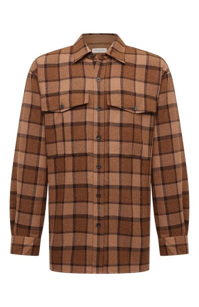 Рубашку в крупную клетку сшили из хлопкового твида с добавлением полиэстера и вискозы. Свободную модель со спущенной линией плеч и разрезами по бокам дополнили накладными карманами с клапанами.