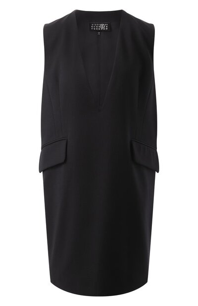 Свободное мини-платье из костюмного материала дополнили двумя карманами с клапанами. Модель с глубоким клиновидным вырезом, украшенное фирменными стежками сзади, можно носить самостоятельно или в сочетании с брюками.