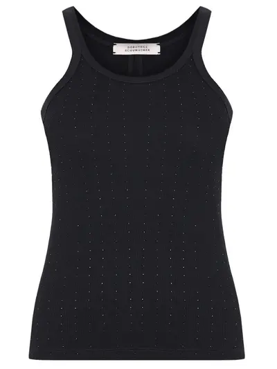 -Черный трикотажный топ из мягкого хлопка от DOROTHEE SCHUMACHER. -Модель полуприлегающего кроя на бретелях, с круглым вырезом горловины. -Топ украшен мелкими стразами в тон, которые эффектно переливаются при любом освещении.