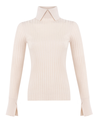 Бежевый полувер с необычным воротником стойкой и отложными лацканами сможет найти общий язык с вещами и из повседневного, и из офисного гардероба. Модель изготовили из фактурного трикотажа на основе премиальной шерсти включив в состав шелк и кашемир. Полувер с длинными рукавами с небольшими разрезами на манжетах.