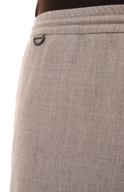 Эластичные брюки с широким поясом-кулиской сшиты из шерстяной фланели с добавлением кашемира. Модель с тремя карманами дополнена сбоку небольшим D-образным кольцом с логотипом марки.