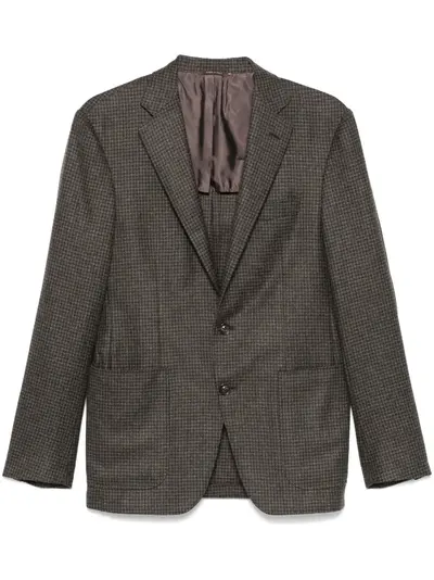 chocolate brown/anthracite grey cashmere houndstooth pattern front button fastening notched lapels long sleeves buttoned cuffs chest welt pocket dart detailing two side patch pockets English rear vents two internal slip pockets partial lining straight hem