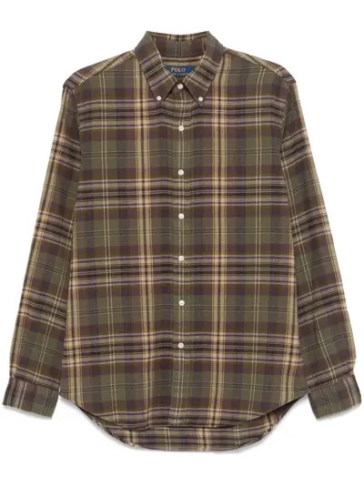 olive green/multicolour cotton flannel plaid check pattern front button placket button-down collar long sleeves with buttoned cuffs signature Polo Pony embroidered to the chest box-pleat detail to the back curved hem