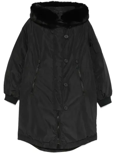 black recycled polyester down-feather filling padded design waterproof front button and zip fastening stand-up collar detachable drawstring hood faux fur-trimmed hood long sleeves elasticated cuffs two side zip-fastening pockets diamond-quilted lining internal pocket curved hem