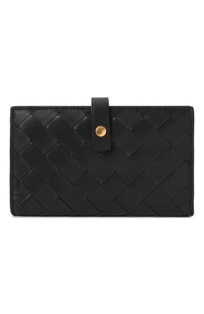 Портмоне двойного сложения сплели в технике intreccio ad inserto из тонкой кожи. Переднюю панель дополнили ремешком с кнопкой, а под задней разместили монетный карман на молнии. Внутри – отделение для купюр, десять слотов для карт и четыре для чеков.