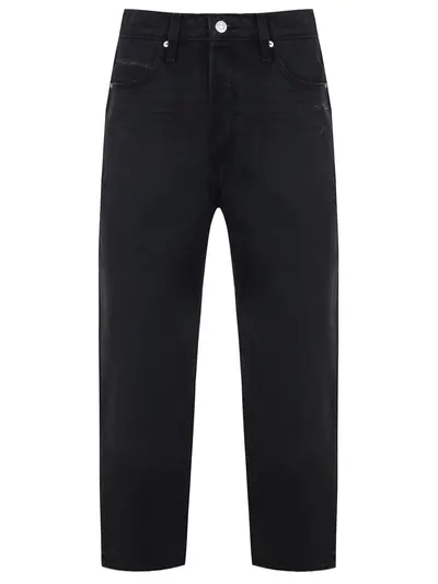 -Черные джинсы купажированного состава от PAIGE. -Модель прямого кроя с высокой посадкой, поясом со шлевками, прорезными и накладными карманами, застежкой на пуговицы, нашивкой с логотипом бренда сзади, декоративными потертостями.